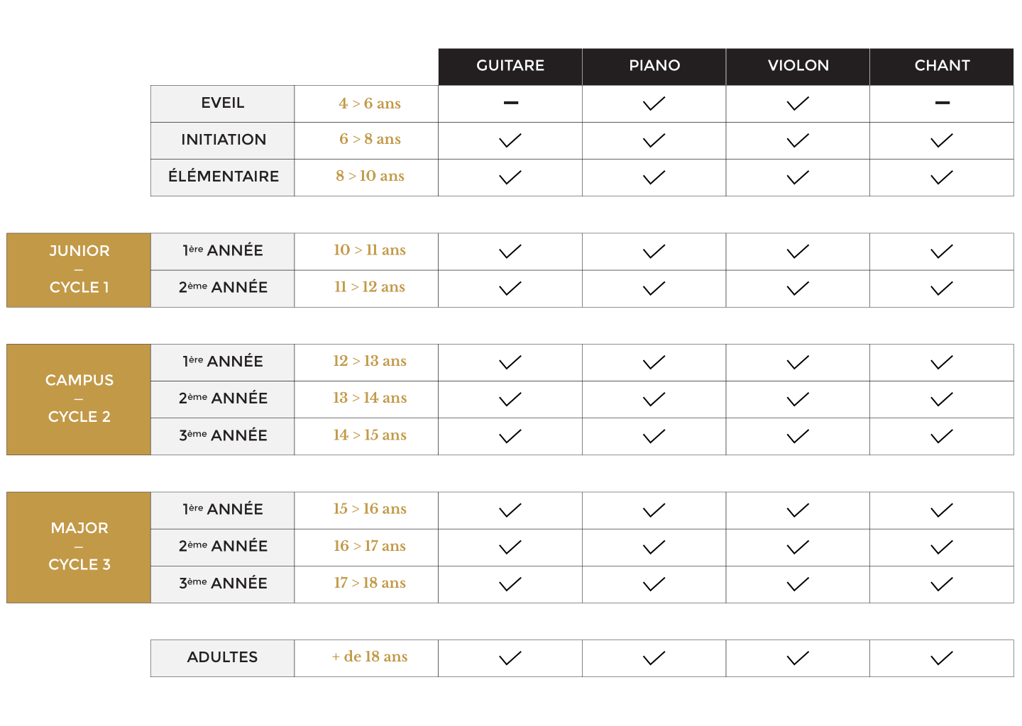 Notre cursus musical est inspiré des cursus de conservatoire, et comprend 3 cycles. Un cycle est composé de 2 voire 3 années.